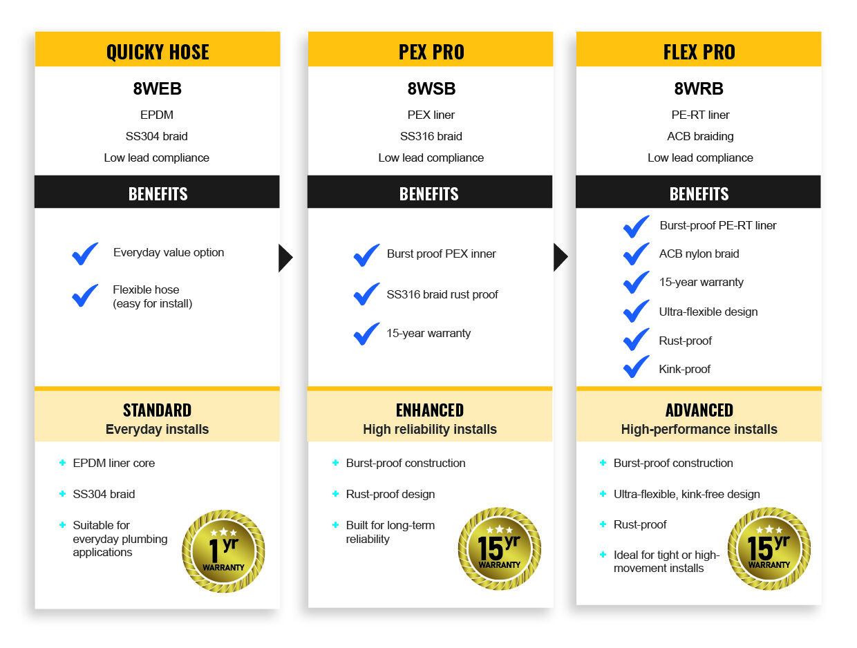 With a burst-proof PEX inner and corrosion-resistant SS316 braid, PEX Pro is designed for installations where longevity matters most. This hose is engineered to handle higher pressures and harsher conditions. It’s suitable for jobs where access may be restricted after installation, and long-term reliability is essential, as suggested by its 15-year warranty.
