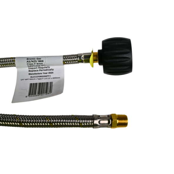 Bromic flexible stainless steel Class F pigtail assembly manufactured in accordance with AS/NZS1869 and approved by the Australian Gas Association for use with gas. Includes type 27 / LCC27 connection.